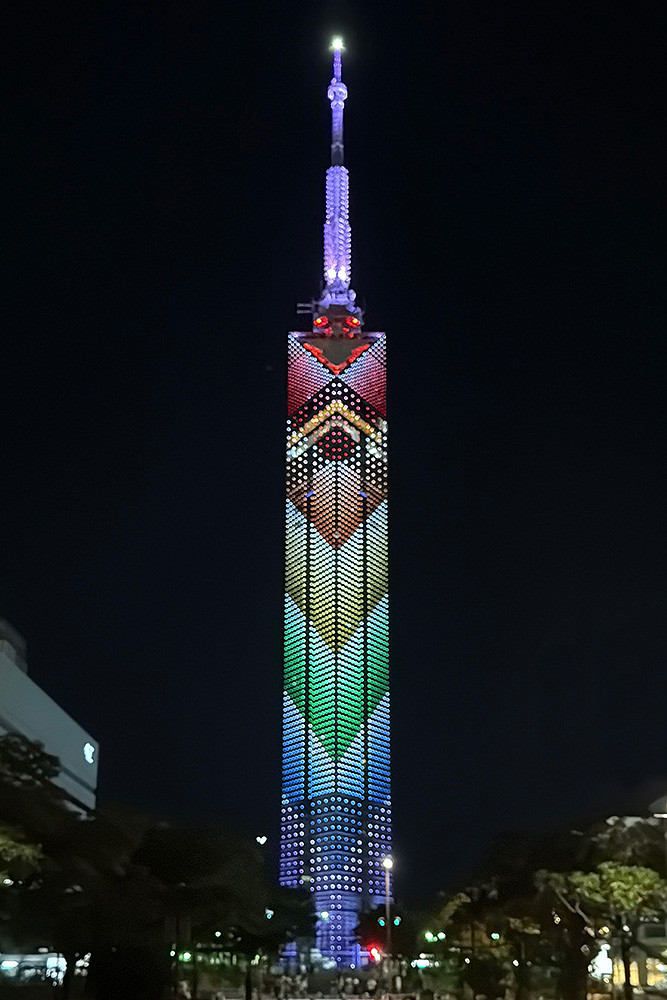 ※この記録においてピクセルアニメイルミネーションとは、個々のピクセルを使い動く映像を作り上げるデジタルアートと定義されています。福岡タワーでは、壁面に設置した2,706基のLEDドットを一つずつ制御し、タワー全体を巨大なスクリーンのように使って、アニメーション演出を行っています。