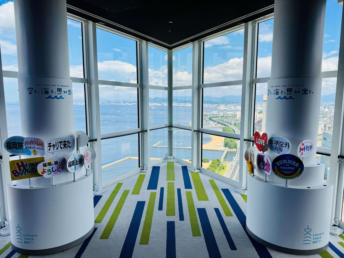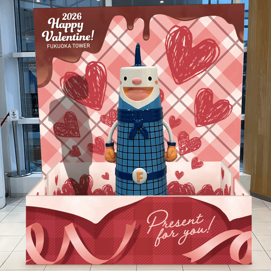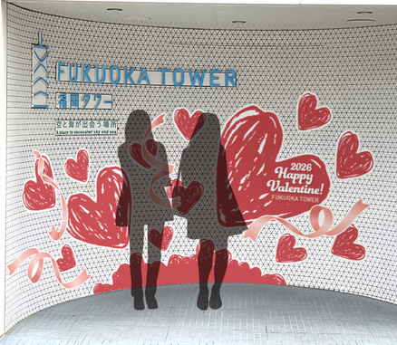 タワー入口のフォトスポットと福岡タワーのゆるキャラ「フータくん」とのフォトスポットが可愛いハートバージョンに変わります。
